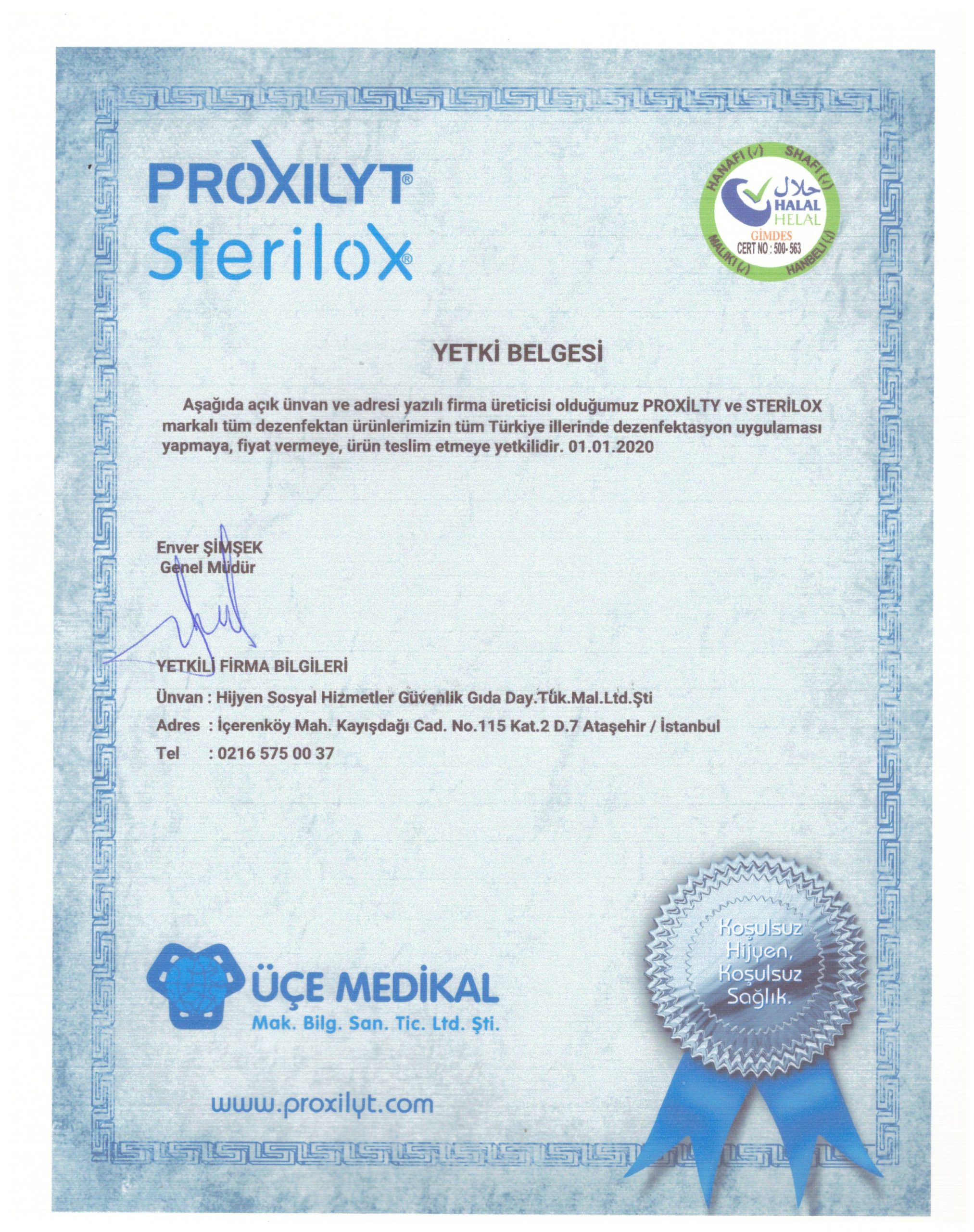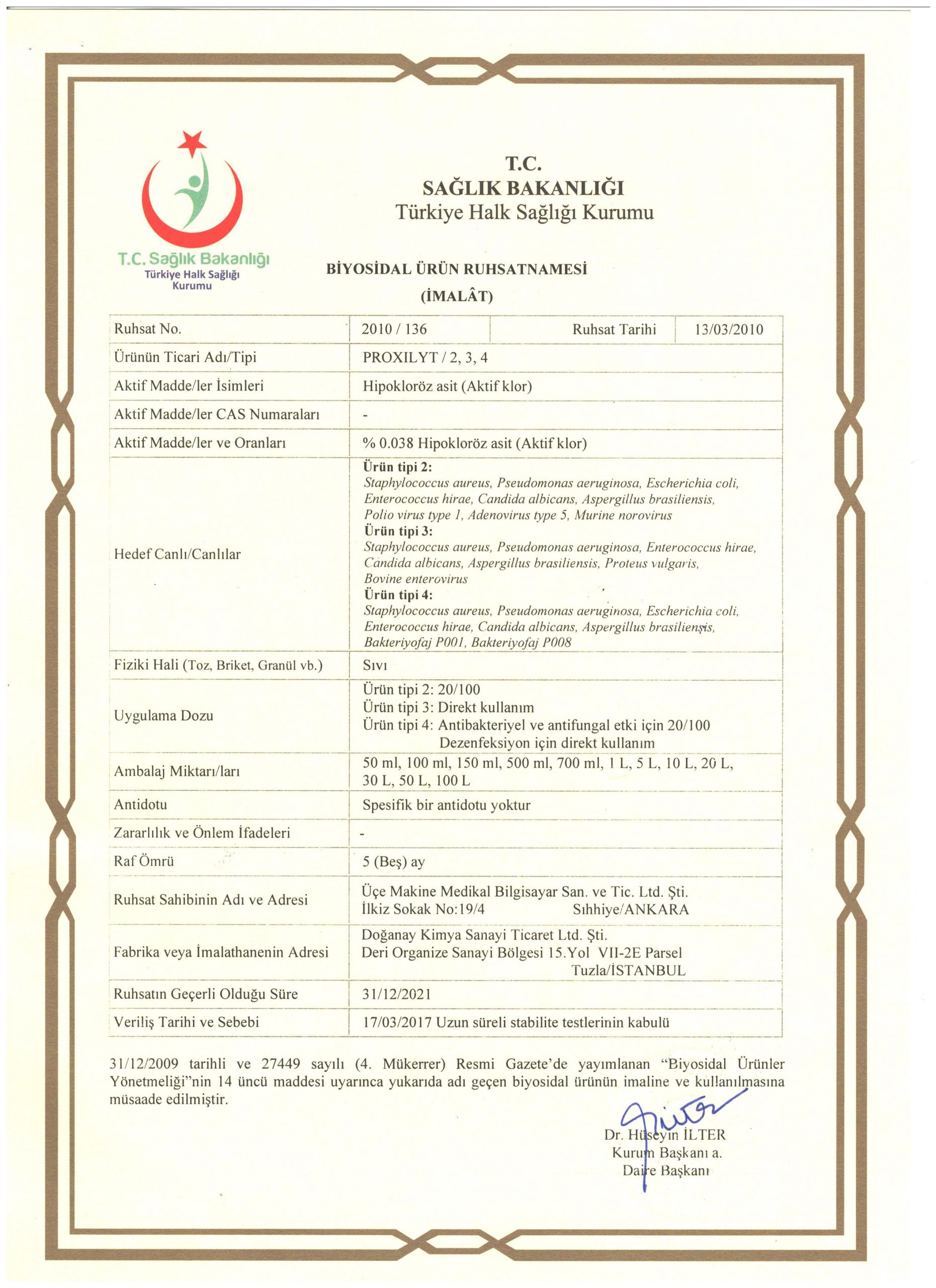 T.C. Sağlık Bakanlığı’ndan Proxilyt Yer ve Yüzey Dezenfektanı olarak Biyosidal Ürün Ruhsatı alınmıştır.